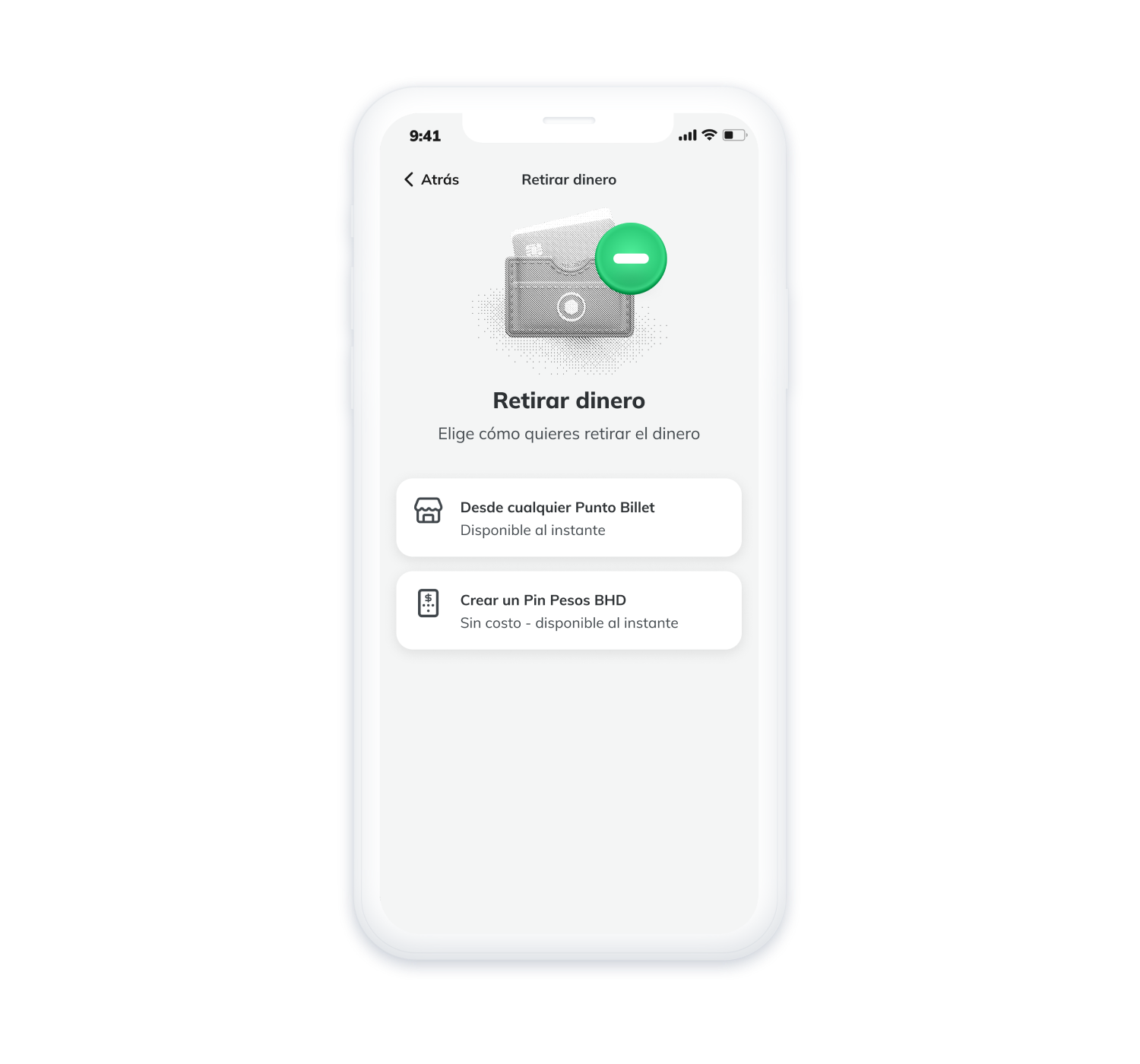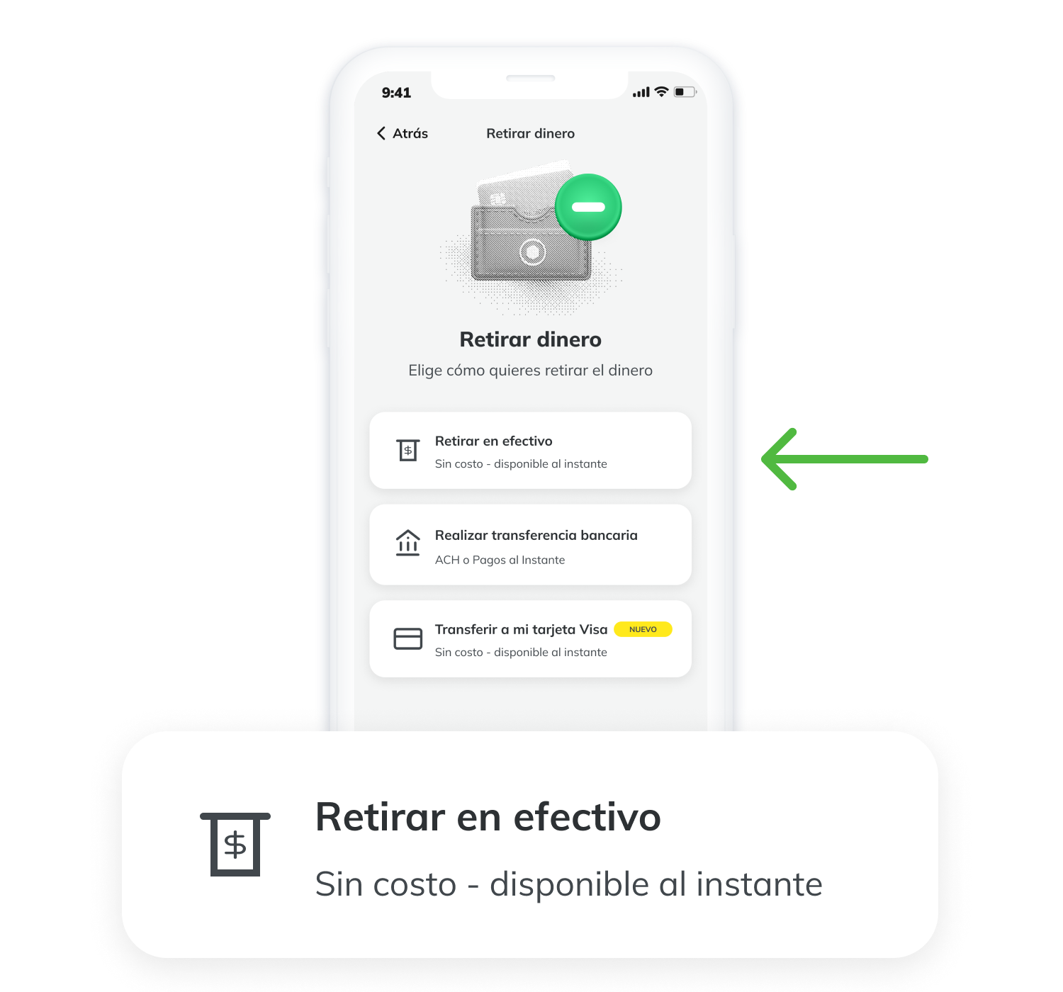 1) Presiona en la opción ''Retirar dinero'' seleccionando ''Retiro en Efectivo''